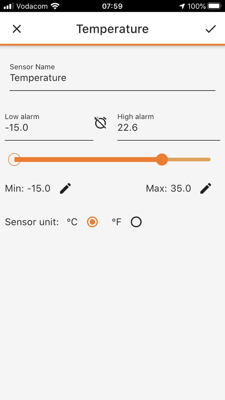 Once added, you can edit the setup of each device to meet your exact requirements. Simply tap any device widget to access the detail page of that device. The menu on the device detail page allows you to edit the device name, view device specific information or delete the device. You can also toggle muting of the device alarms by tapping the icon. You will also see a tab page for each enabled sensor of the device. This page provides an entry-point to edit the ranges and alarms of the sensor, as well as a trend of its latest values.